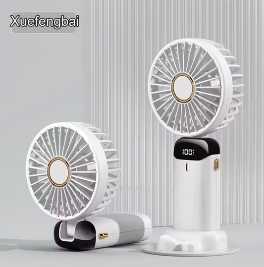 2400mAh Foldable USB Rechargeable Mini Handheld Fan – With Phone Stand, Neck Strap & Display Screen – Ideal for Car, Travel & Outdoor Use