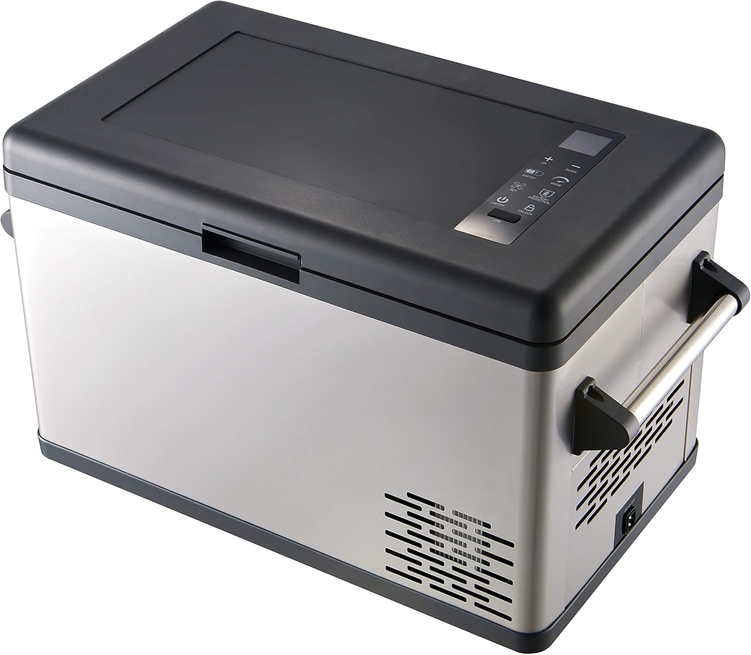 For your convenience, the fridge features built-in LED interior lighting, a soft-close lid with safety damper, and a USB port to charge your mobile devices. The exterior is crafted with durable brushed aluminum and accented with matte black trim for a modern, rugged look that fits seamlessly in vehicles, RVs, tents, or even your backyard.