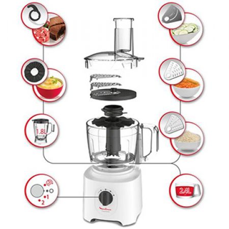 With special features designed for beginners, the Moulinex Easy Force Food Processor delivers perfect results with total ease. Discover a multifunction food processor with 6 accessories that put over 25 different cooking functions at your fingertips. With Easy Force, achieving perfect results is effortless. Each attachment comes with the number of the speed required to be sure to master any recipe easily. Master the art of slicing, shredding, grating, chopping, kneading, emulsifying and more, with all the comfort and convenience of a lightweight and compact design, easy storage features, and dishwasher-safe parts. 800W of power ensures quick results, with two speed settings and a pulse function for total control and precision. The 1.8 L blender attachment rounds off the perfect first food processor package, putting delicious smoothies and perfectly-blended shakes within reach.